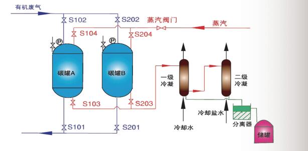 此技術(shù)以活性炭纖維(顆粒)為吸附劑,有機(jī)廢氣先通過預(yù)處理,然后進(jìn)入活性炭纖維(顆粒)吸附箱,有機(jī)廢氣組分吸附在吸附劑表面,然后再經(jīng)過變溫脫附,富集的有機(jī)氣體用飽和蒸汽脫附出來,進(jìn)入冷凝器。液態(tài)化學(xué)品進(jìn)入儲(chǔ)罐,凈化后的尾氣經(jīng)排氣管排放。